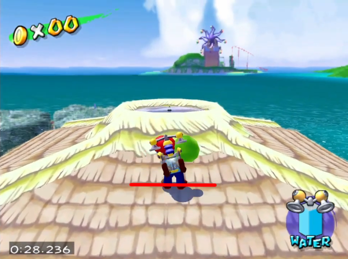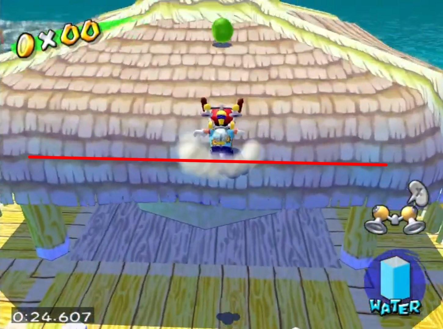 - You will clip at the corner of the hut. Time a hover to hover up into the roof with Mario’s hat barely being visible.